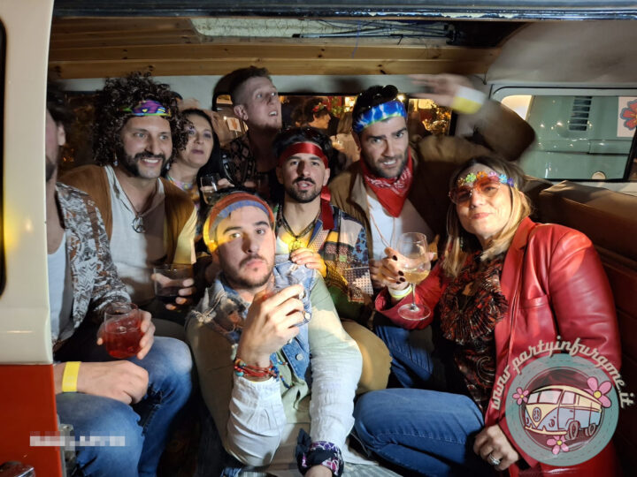 Ci troviamo all’interno dell’immensa Discoteca Formula, dove il brand ha riservato tutti gli spazi per ospitare diversi mezzi foodtruck e attrazioni varie… tra queste, il nostro inimitabile PhotoBooth con le ruote: uno stupendo pulmino Volkswagen bianco-rosso predisposto per accogliere a bordo tutti gli ospiti acconciati in perfetto stile hippie per scattare indimenticabili foto! Il party è invaso dallo spirito Flower Power e nel nostro furgoncino vintage gli scatti non si sprecano… a fine serata saranno oltre 1.200! 😮